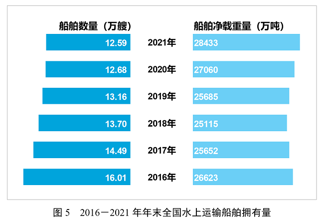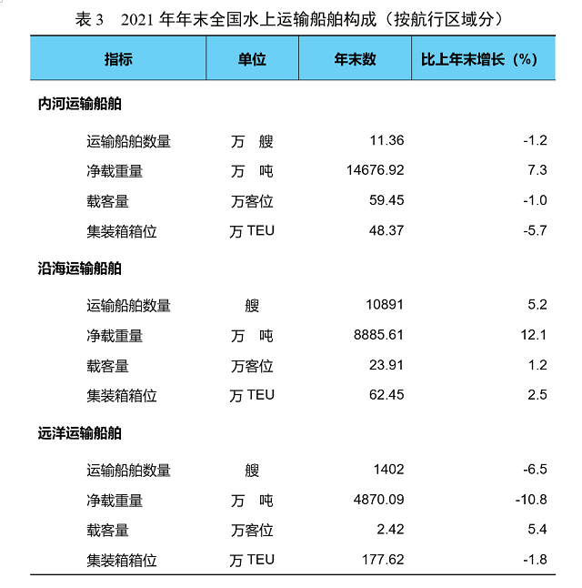 年末全國擁有水上運(yùn)輸船舶12.59萬艘,比上年末下降0.7%,其中凈載重量28432.63萬噸、增長5.1%,載客量85.78萬客位、下降0.3%,集裝箱箱位288.43萬標(biāo)準(zhǔn)箱、下降1.6%。
