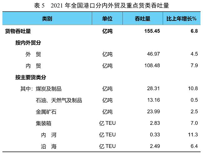 全年全國港口完成貨物吞吐量155.45億噸,比上年增長6.8%。其中,內(nèi)河港口完成55.73億噸、增長9.9%,沿海港口完成99.73億噸、增長5.2%。完成集裝箱鐵水聯(lián)運(yùn)量754萬TEU,增長9.8%。