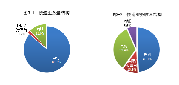 上半年,同城、異地、國(guó)際/港澳臺(tái)快遞業(yè)務(wù)量分別占全部快遞業(yè)務(wù)量的12.0%、86.3%和1.7%;業(yè)務(wù)收入分別占全部快遞業(yè)務(wù)收入的6.6%、49.1%和10.9%。與去年同期相比,同城快遞業(yè)務(wù)量的比重下降1.1個(gè)百分點(diǎn),異地快遞業(yè)務(wù)量的比重上升1.6個(gè)百分點(diǎn),國(guó)際/港澳臺(tái)業(yè)務(wù)量的比重下降0.5個(gè)百分點(diǎn)。
