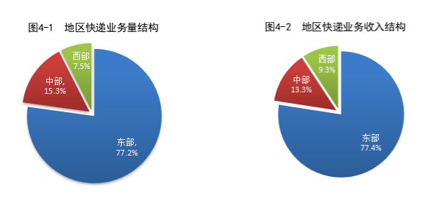 上半年,東、中、西部地區(qū)快遞業(yè)務(wù)量比重分別為77.2%、15.3%和7.5%,業(yè)務(wù)收入比重分別為77.4%、13.3%和9.3%。與去年同期相比,東部地區(qū)快遞業(yè)務(wù)量比重下降1.4個(gè)百分點(diǎn),快遞業(yè)務(wù)收入比重下降1.1個(gè)百分點(diǎn);中部地區(qū)快遞業(yè)務(wù)量比重上升1.1個(gè)百分點(diǎn),快遞業(yè)務(wù)收入比重上升0.6個(gè)百分點(diǎn);西部地區(qū)快遞業(yè)務(wù)量比重上升0.3個(gè)百分點(diǎn),快遞業(yè)務(wù)收入比重上升0.5個(gè)百分點(diǎn)。