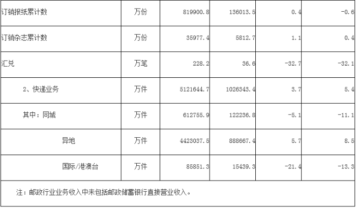 單位 | 快遞業(yè)務(wù)量累計(jì) | 同比增長(zhǎng) | 快遞業(yè)務(wù)收入累計(jì) | 同比增長(zhǎng) |