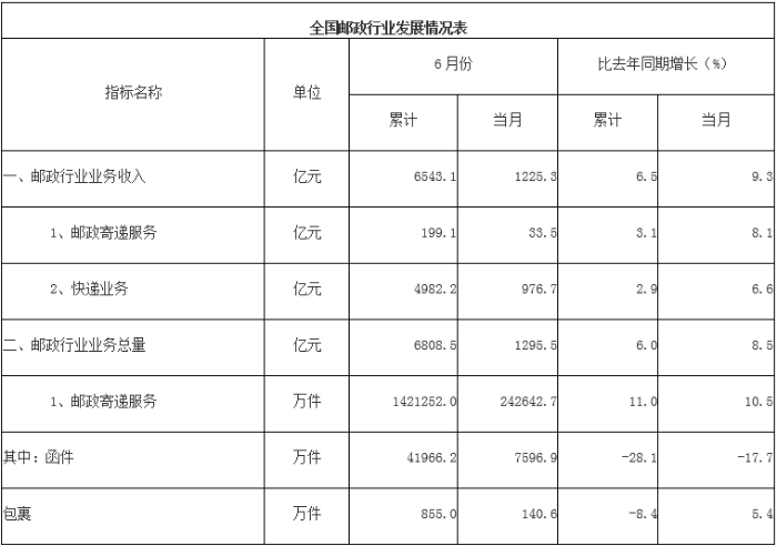 上半年,郵政行業(yè)業(yè)務(wù)收入(不包括郵政儲(chǔ)蓄銀行直接營(yíng)業(yè)收入)累計(jì)完成6543.1億元,同比增長(zhǎng)6.5%;業(yè)務(wù)總量累計(jì)完成6808.5億元,同比增長(zhǎng)6.0%。