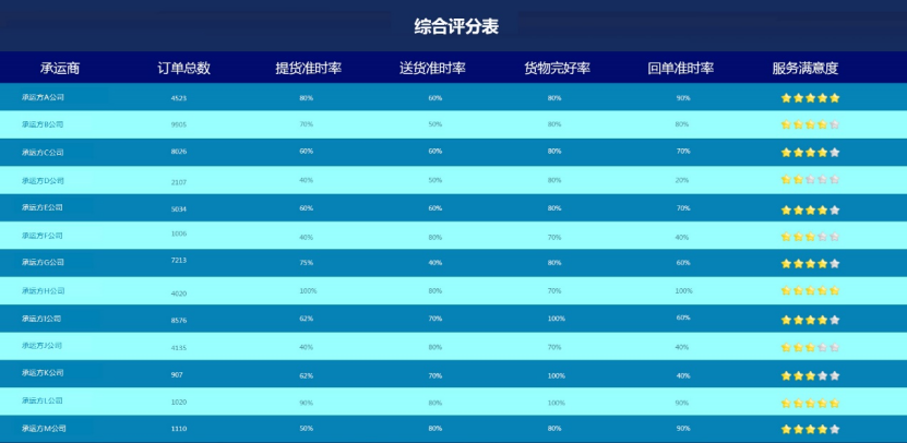 該物流企業(yè)貨物從起運(yùn)到簽收,物流源的大數(shù)據(jù)技術(shù)將顆?;膶?shí)時(shí)在途數(shù)據(jù)、事件進(jìn)行匯總分析,以數(shù)據(jù)大屏等可視化形式,呈現(xiàn)貨物的提貨準(zhǔn)時(shí)率、送貨準(zhǔn)時(shí)率、簽收準(zhǔn)時(shí)率、貨損率、簽收滿意度等信息,實(shí)現(xiàn)運(yùn)輸考核的數(shù)據(jù)化。將此推送給客戶,主動(dòng)為發(fā)貨客戶提供監(jiān)督運(yùn)輸服務(wù)的真實(shí)KPI數(shù)據(jù),有利于企業(yè)不斷提高自身的運(yùn)輸服務(wù)水平和客戶的滿意度。