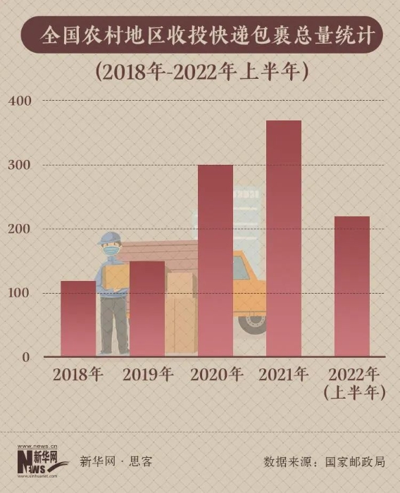 從上圖可以看出,2018年-2021年,全國農(nóng)村地區(qū)快遞包裹收投總量在逐年上升,由2018年的120億件上升到2021年的370億件。龐大的快遞包裹數(shù)據(jù)背后,是加速推進(jìn)的“快遞進(jìn)村”步伐和不斷增強(qiáng)的農(nóng)村經(jīng)濟(jì)活力,也讓人看到了農(nóng)村消費(fèi)市場蘊(yùn)藏的巨大潛力。