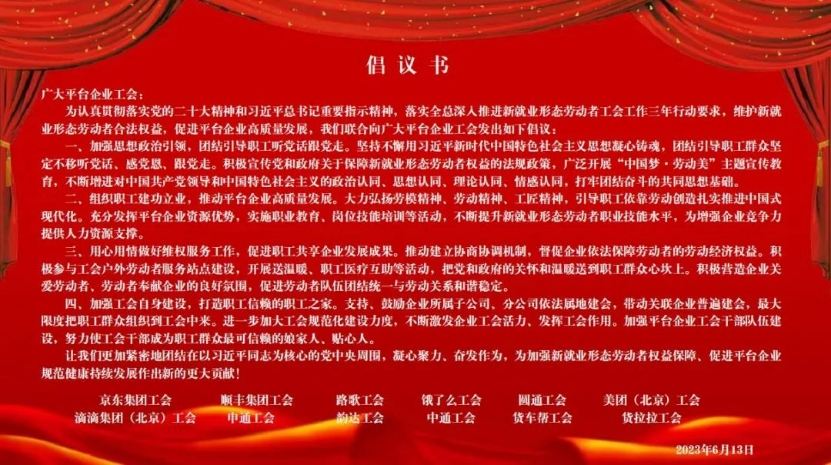 會上,京東、順豐、美團、滴滴、餓了么和滿幫集團旗下貨車幫等12家頭部平臺企業(yè)工會聯(lián)合發(fā)出倡議,呼吁廣大平臺企業(yè)落實全總“三年行動”要求,維護新就業(yè)形態(tài)勞動者合法權益,促進企業(yè)高質量發(fā)展。