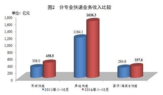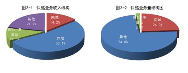 1-10月份,同城、異地、國(guó)際/港澳臺(tái)快遞業(yè)務(wù)收入分別占全部快遞收入的14.2%、53.1%和11%;業(yè)務(wù)量分別占全部快遞業(yè)務(wù)量的24%、74%和2%。與去年同期相比,同城快遞業(yè)務(wù)收入的比重下降0.3個(gè)百分點(diǎn),異地快遞業(yè)務(wù)收入的比重下降1.5個(gè)百分點(diǎn),國(guó)際/港澳臺(tái)業(yè)務(wù)收入的比重下降2.8個(gè)百分點(diǎn)。