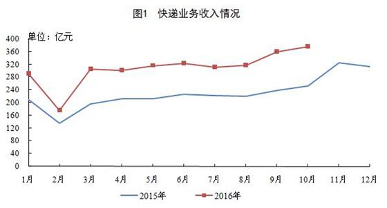10月份,快遞業(yè)務(wù)量完成30.3億件,同比增長(zhǎng)55.9%;業(yè)務(wù)收入完成376.2億元,同比增長(zhǎng)49.1%。