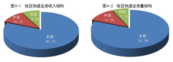 1-10月份,東、中、西部地區(qū)快遞業(yè)務(wù)收入的比重分別為81.1%、10.7%和8.2%,業(yè)務(wù)量比重分別為81%、11.9%和7.1%。與去年同期相比,東部地區(qū)快遞業(yè)務(wù)收入比重下降了0.7個(gè)百分點(diǎn),快遞業(yè)務(wù)量比重下降了0.9個(gè)百分點(diǎn);中部地區(qū)快遞業(yè)務(wù)收入比重上升了0.4個(gè)百分點(diǎn),快遞業(yè)務(wù)量比重上升了0.7個(gè)百分點(diǎn);西部地區(qū)快遞業(yè)務(wù)收入比重上升了0.3個(gè)百分點(diǎn),快遞業(yè)務(wù)量比重上升了0.2個(gè)百分點(diǎn)。