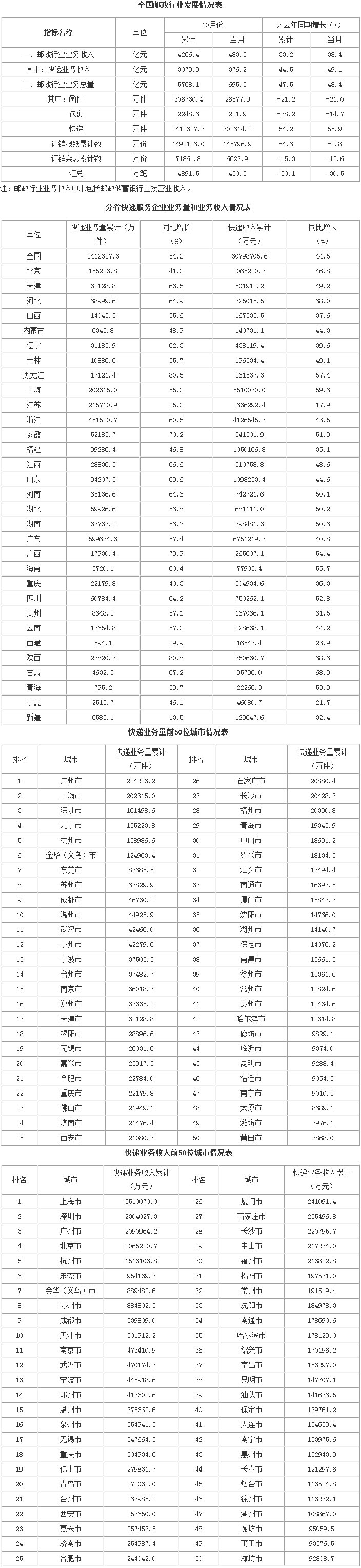 10月份,全行業(yè)業(yè)務(wù)收入完成483.5億元,同比增長(zhǎng)38.4%;業(yè)務(wù)總量完成695.5億元,同比增長(zhǎng)48.4%。