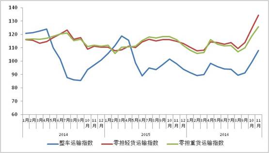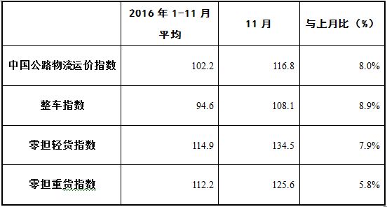 中國公路物流運價指數(shù)2016年11月為116.8點,比上月回升8.0%。運價指數(shù)連續(xù)三個月環(huán)比回升,公路物流需求保持平穩(wěn)較快增長趨勢。特別是受到“雙十一”電商促銷的影響,與消費相關(guān)的物流需求表現(xiàn)活躍,根據(jù)國家郵政局監(jiān)測數(shù)據(jù)顯示,11月11日,主要電商企業(yè)全天共產(chǎn)生物流訂單3.5億件,同比增長59%,成為拉動公路物流需求增長的動力。