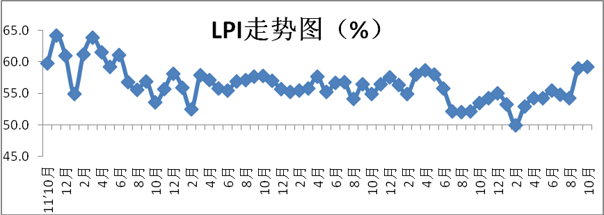 固定資產(chǎn)投資完成額指數(shù)回升,物流基礎(chǔ)設(shè)施趨于改善。10月份,固定資產(chǎn)投資完成額指數(shù)為52.6%,回升2.3個(gè)百分點(diǎn),反映出物流運(yùn)行的基礎(chǔ)設(shè)施條件有所改善。