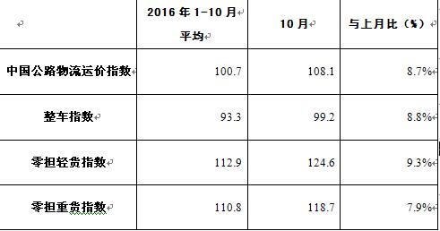 表1 2016年10月中國公路物流運(yùn)價(jià)指數(shù)表