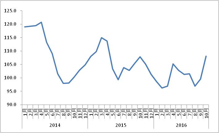 中國公路物流運(yùn)價(jià)指數(shù)2016年10月為108.1點(diǎn),比上月回升8.7%,回升幅度為年內(nèi)的最高。運(yùn)價(jià)指數(shù)連續(xù)兩個(gè)月環(huán)比回升,且回升幅度比上年同期擴(kuò)大5個(gè)百分點(diǎn)。這也顯示出,本月運(yùn)價(jià)指數(shù)的回升一方面是受到公路物流市場(chǎng)傳統(tǒng)旺季來臨,“雙十一”將近備貨需求明顯回升等因素影響;另一方面,也是受到治超新政推進(jìn)、市場(chǎng)運(yùn)力結(jié)構(gòu)調(diào)整等因素影響,運(yùn)輸費(fèi)用水平有所上漲,帶動(dòng)價(jià)格指數(shù)回升。從各周情況看,月內(nèi)各周均有所回升,各周呈現(xiàn)“連續(xù)性上漲,幅度有所回調(diào)”的態(tài)勢(shì)。