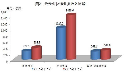 1-9月份,全國快遞服務企業(yè)業(yè)務量累計完成211億件,同比增長54%;業(yè)務收入累計完成2703.7億元,同比增長43.9%。其中,同城業(yè)務收入累計完成385.3億元,同比增長41.4%;異地業(yè)務收入累計完成1438.6億元,同比增長40.1%;國際/港澳臺業(yè)務收入累計完成300.8億元,同比增長14.1%。