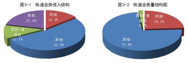 1-9月份,同城、異地、國際/港澳臺快遞業(yè)務收入分別占全部快遞收入的14.3%、53.2%和11.1%;業(yè)務量分別占全部快遞業(yè)務量的24.2%、73.8%和2%。與去年同期相比,同城快遞業(yè)務收入的比重下降0.2個百分點,異地快遞業(yè)務收入的比重下降1.5個百分點,國際/港澳臺業(yè)務收入的比重下降2.9個百分點。
