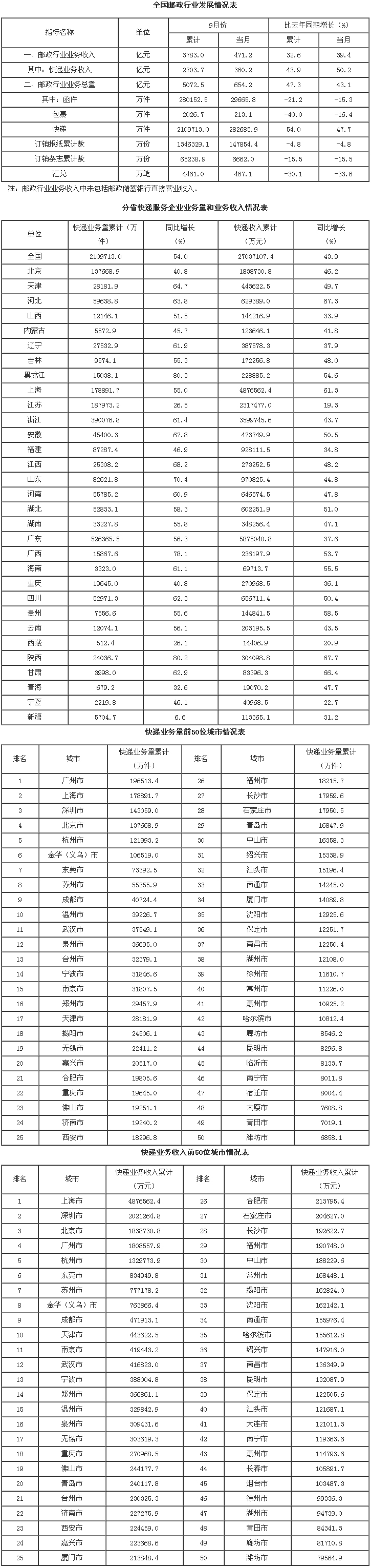 9月份,快遞業(yè)務量完成28.3億件,同比增長47.7%;業(yè)務收入完成360.2億元,同比增長50.2%。
