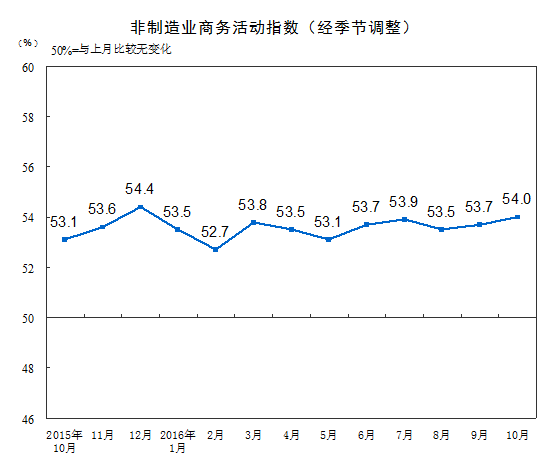 2016年10月份,中國非制造業(yè)商務(wù)活動指數(shù)為54.0%,比上月上升0.3個百分點,為今年以來的高點,表明非制造業(yè)保持?jǐn)U張態(tài)勢,增速繼續(xù)加快。