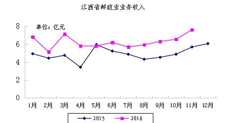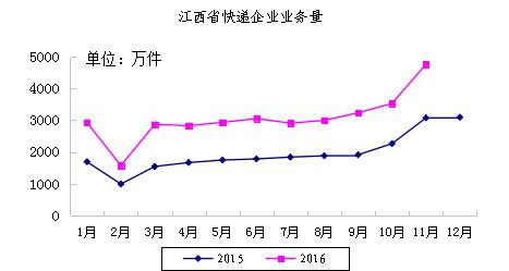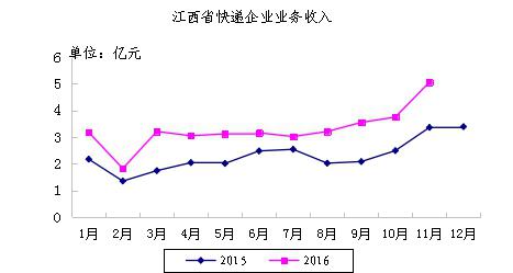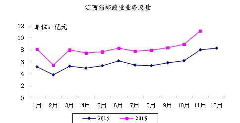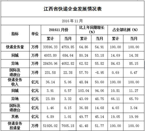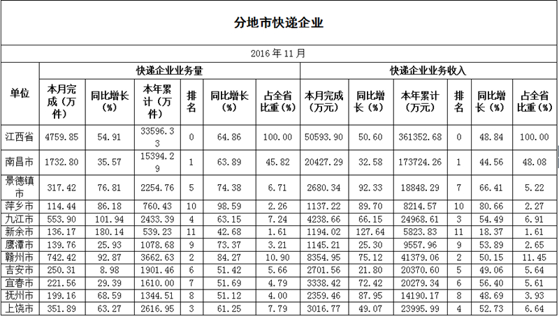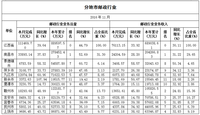 2016年11月,江西省郵政企業(yè)和快遞服務(wù)企業(yè)業(yè)務(wù)收入(不包括郵政儲(chǔ)蓄銀行直接營(yíng)業(yè)收入)本年累計(jì)完成68.90億元,全國(guó)排第19位,同比增長(zhǎng)30.11%;江西省郵政企業(yè)和快遞服務(wù)企業(yè)業(yè)務(wù)總量本年累計(jì)完成88.96億元,全國(guó)排名第15位,同比增長(zhǎng)44.79%。