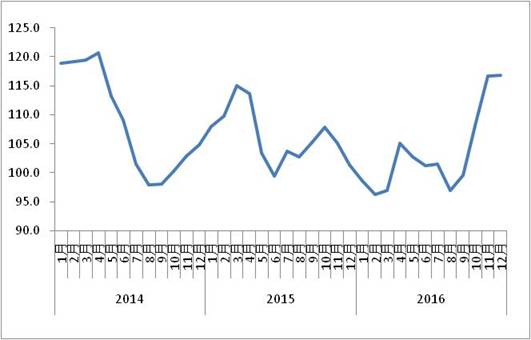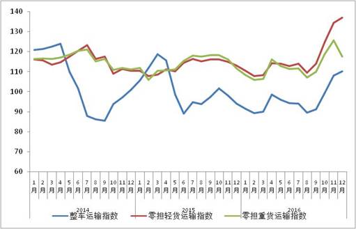 由中國(guó)物流與采購(gòu)聯(lián)合會(huì)和林安物流集團(tuán)聯(lián)合調(diào)查的中國(guó)公路物流運(yùn)價(jià)指數(shù)2016年12月為116.8點(diǎn),比上月回升0.06%,運(yùn)價(jià)指數(shù)連續(xù)四個(gè)月環(huán)比回升,比上年同期增長(zhǎng)15.3%,全年總體高于去年同期水平。9月份以來(lái),受到治超新政實(shí)施等因素影響,運(yùn)輸費(fèi)用持續(xù)上漲,加之物流需求穩(wěn)中有升,多重因素共同影響,帶動(dòng)價(jià)格指數(shù)連續(xù)回升。