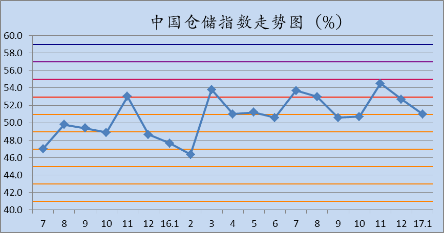 中國(guó)物流與采購(gòu)聯(lián)合會(huì)與中儲(chǔ)發(fā)展股份有限公司聯(lián)合調(diào)查的2017年1月中國(guó)倉(cāng)儲(chǔ)指數(shù)為51.0%,較上月回落1.7個(gè)百分點(diǎn),連續(xù)十一個(gè)月位于擴(kuò)張區(qū)間。各分項(xiàng)指數(shù)中,除新訂單指數(shù)、延伸業(yè)務(wù)量指數(shù)、設(shè)施利用率指數(shù)、企業(yè)員工指數(shù)及業(yè)務(wù)活動(dòng)預(yù)期指數(shù)較上月有所回升外,其余指數(shù)均有不同程度的回落。