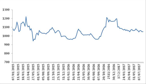 圖 1 2015-2017年各周中國(guó)公路物流運(yùn)價(jià)指數(shù)
