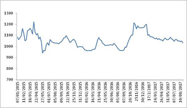 圖 1 2015-2017年各周中國公路物流運(yùn)價(jià)指數(shù)