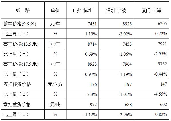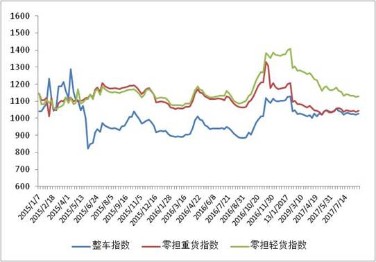 各車型指數(shù)波動(dòng)幅度較小但均有同程度回落,零擔(dān)指數(shù)回落幅度高于整車指數(shù)。其中,整車指數(shù)為1010.66點(diǎn),比上周回落1.54%,比上年同期增長14.13%;零擔(dān)輕貨指數(shù)為1108.79點(diǎn),環(huán)比回落1.65%;零擔(dān)重貨指數(shù)為1023.93點(diǎn),環(huán)比回落1.87 %。