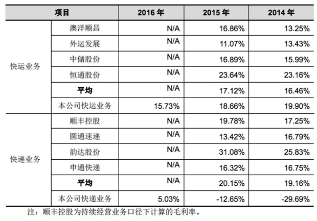 此外,2016 年期間,毛利率較高的精準(zhǔn)卡航/城運(yùn)業(yè)務(wù)(零擔(dān)運(yùn)輸?shù)闹饕问剑┢骄鶈蝺r(jià)較上一年下降了 3.66%,精準(zhǔn)汽運(yùn)(屬零擔(dān)運(yùn)輸)的單價(jià)也由 2014 年的 1.09 元/噸公里下降至 2016 年的 0.84 元/噸公里。