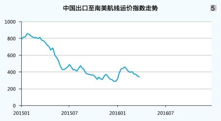 南美航線:市場(chǎng)運(yùn)價(jià)急漲緩跌。因當(dāng)?shù)刂饕?jīng)濟(jì)體經(jīng)濟(jì)持續(xù)低迷,拖累運(yùn)輸需求遲遲未現(xiàn)恢復(fù)跡象,春節(jié)前船舶平均艙位利用率僅上升至七成左右,市場(chǎng)運(yùn)價(jià)回升乏力。1月初運(yùn)價(jià)雖一度反彈至近400美元/TEU,但隨即快速下跌,至1月底市場(chǎng)最低運(yùn)價(jià)已重回50美元/TEU左右水平。節(jié)后市場(chǎng),雖然班輪公司采取大規(guī)模運(yùn)力收縮措施,但船舶平均艙位利用率仍不足五成。市場(chǎng)平均運(yùn)價(jià)于2月中旬一度跌至100美元/TEU以下,創(chuàng)SCFI發(fā)布以來(lái)新低。直至2月底,雖然供需關(guān)系依舊未見好轉(zhuǎn),多數(shù)班輪公司仍堅(jiān)決拉漲運(yùn)價(jià),市場(chǎng)運(yùn)價(jià)大幅反彈至800美元/TEU以上,單周漲幅達(dá)725.3%,但由于運(yùn)力過(guò)剩情況嚴(yán)重,漲后運(yùn)價(jià)即開始逐周下跌。3月25日,上海航運(yùn)交易所發(fā)布的中國(guó)出口至南美航線運(yùn)價(jià)指數(shù)為355.0點(diǎn),較年初上升11.3%,一季度平均為396.9點(diǎn),同比下跌51.3%(見圖5)。
