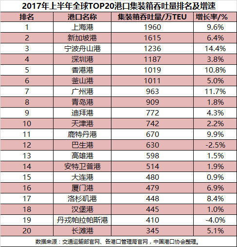在全球20大集裝箱港口中,中國(guó)港口增速最高,并且上海港、寧波舟山港、香港港、廣州港等中國(guó)港口集裝箱吞吐量增速高于全球平均水平。其中,寧波舟山港完成集裝箱吞吐量1236萬(wàn)TEU,增速高達(dá)14.4%;廣州港集裝箱吞吐量為963萬(wàn)TEU,增速為11.7%;今年上半年香港港集裝箱吞吐量同比增長(zhǎng)10.8%至1019萬(wàn)TEU;鹿特丹港、上海港增速也緊隨其后,分別為9.9%、9.6%。 此外,在全球前20大集裝箱港口中僅有兩家港口出現(xiàn)負(fù)增長(zhǎng),即馬來(lái)西亞巴生港同比下跌2.5%至630萬(wàn)TEU,丹戎帕拉帕斯港同比下跌4%至410萬(wàn)TEU。