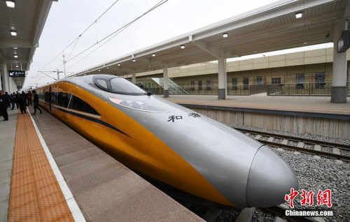 資料圖:2017年3月21日,新型CRH380AJ--0203動車組列車“黃醫(yī)生”從蘭州西車站高速場上線,開始檢測寶蘭客專蘭州西站至東岔站間334公里高鐵行車設備,寶蘭客專(蘭州局管段)聯(lián)調聯(lián)試正式啟動。楊艷敏 攝