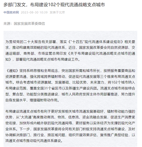 近日,中國(guó)政府網(wǎng)微信公眾號(hào)發(fā)布《多部門(mén)發(fā)文,布局建設(shè)102個(gè)現(xiàn)代流通戰(zhàn)略支點(diǎn)城市》一文: