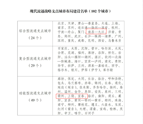 在該文公布的102個(gè)現(xiàn)代流通戰(zhàn)略支點(diǎn)城市中,江西的南昌、九江被納入綜合型流通支點(diǎn)城市,贛州、上饒、宜春被納入功能型流通支點(diǎn)城市。
