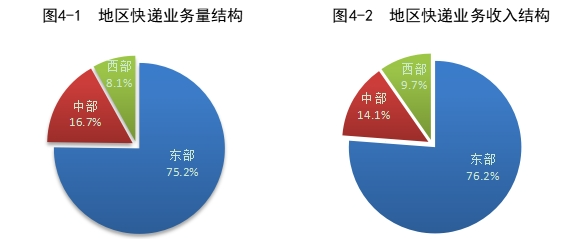 2023年,東、中、西部地區(qū)快遞業(yè)務(wù)量比重分別為75.2%、16.7%和8.1%,業(yè)務(wù)收入比重分別為76.2%、14.1%和9.7%。與去年同期相比,東部地區(qū)快遞業(yè)務(wù)量比重下降1.6個(gè)百分點(diǎn),快遞業(yè)務(wù)收入比重下降1.4個(gè)百分點(diǎn);中部地區(qū)快遞業(yè)務(wù)量比重上升1.0個(gè)百分點(diǎn),快遞業(yè)務(wù)收入比重上升0.7個(gè)百分點(diǎn);西部地區(qū)快遞業(yè)務(wù)量比重上升0.6個(gè)百分點(diǎn),快遞業(yè)務(wù)收入比重上升0.7個(gè)百分點(diǎn)。