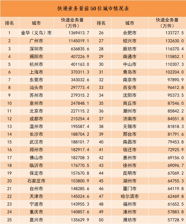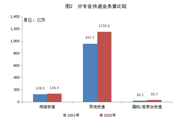 2023年,同城快遞業(yè)務(wù)量累計(jì)完成136.4億件,同比增長6.6%;異地快遞業(yè)務(wù)量累計(jì)完成1153.6億件,同比增長20.5%;國際/港澳臺快遞業(yè)務(wù)量累計(jì)完成30.7億件,同比增長52.0%。