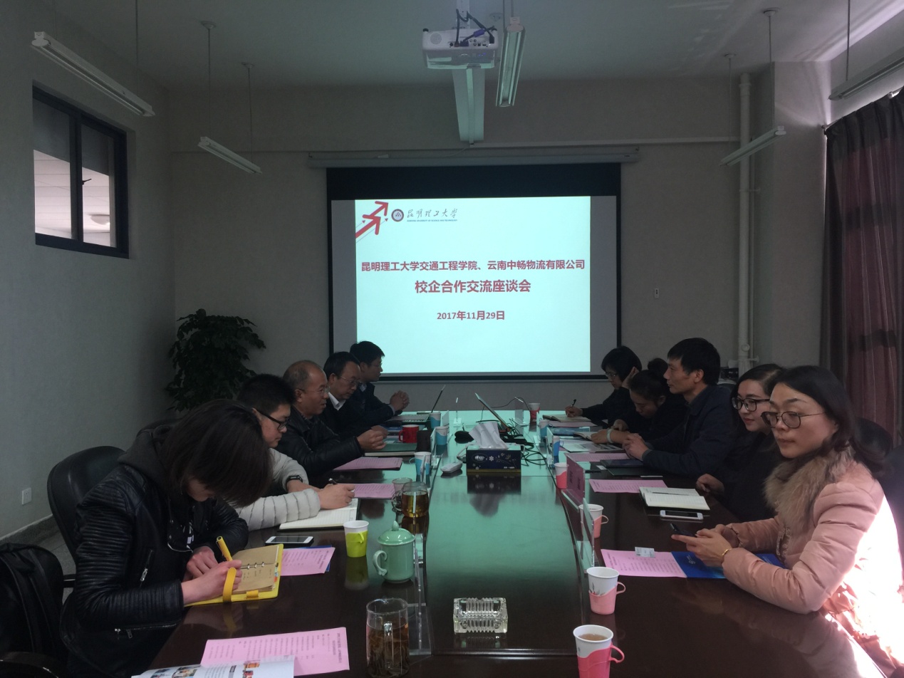 11月29日,云南中暢物流有限公司藍(lán)濟(jì)昌董事長(zhǎng)一行5人,到昆明理工大學(xué)交通工程學(xué)院洽談校企合作事宜。交通工程學(xué)院黨政領(lǐng)導(dǎo)及物流系教師代表參加座談交流。