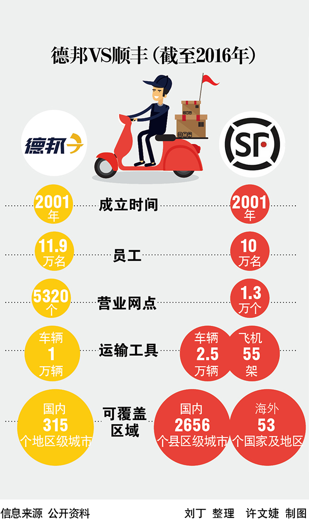 2013年11月,德邦的快遞業(yè)務(wù)正式上線,當(dāng)年建設(shè)了332個(gè)網(wǎng)點(diǎn),到2016年底,網(wǎng)點(diǎn)數(shù)量達(dá)到了4983個(gè),快遞業(yè)務(wù)的發(fā)貨量達(dá)到128萬噸,年票數(shù)達(dá)到1.6億票,收入達(dá)到41億元。