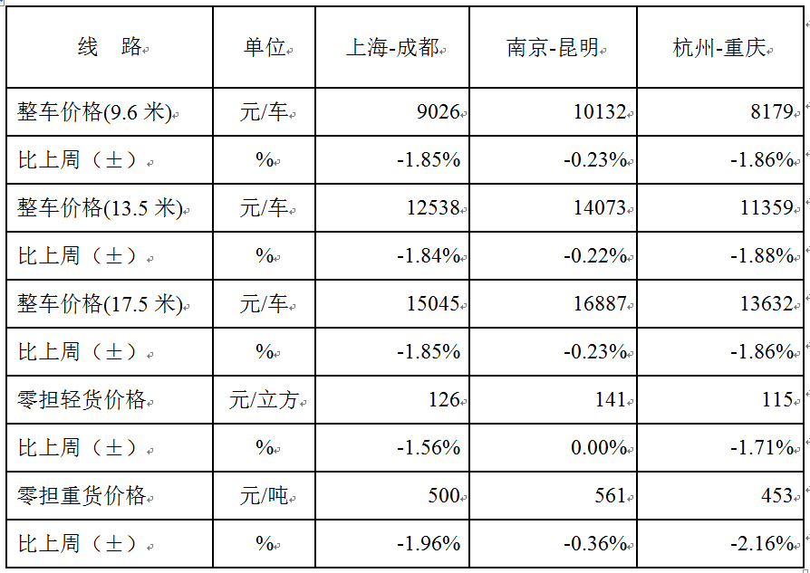 表1 本周部分線路平均價(jià)格及環(huán)比情況對比