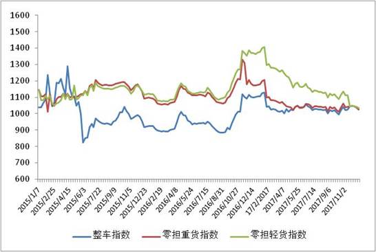 本周(2017年12月18日~12月22日),由中國物流與采購聯(lián)合會和林安物流集團(tuán)聯(lián)合調(diào)查的中國公路物流運(yùn)價(jià)指數(shù)1029.15點(diǎn),上周指數(shù)應(yīng)為1039.6點(diǎn),環(huán)比回落1.01%。