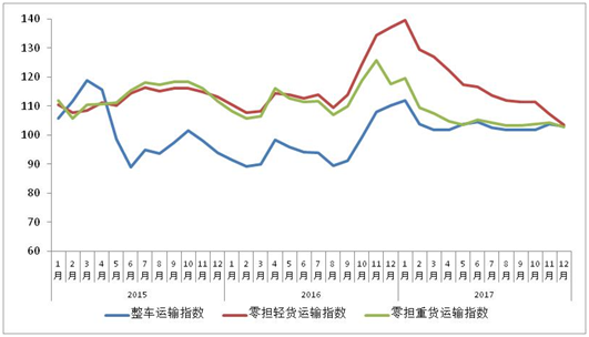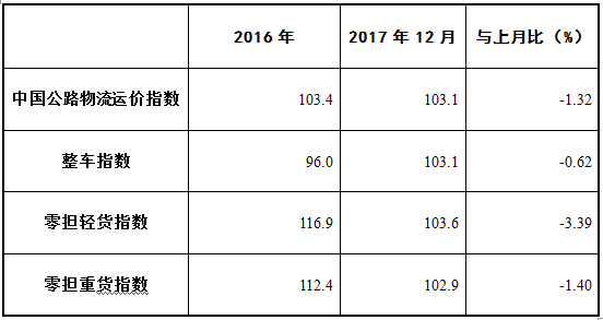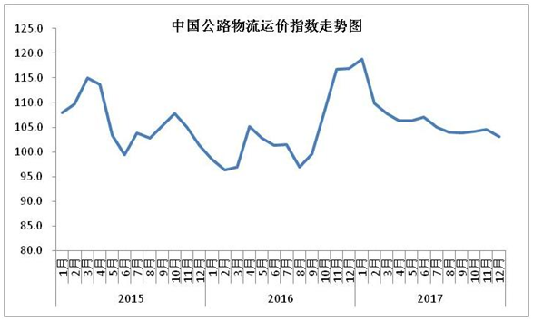 由中國物流與采購聯(lián)合會(huì)和林安物流集團(tuán)聯(lián)合調(diào)查的中國公路物流運(yùn)價(jià)指數(shù)2017年12月為103.1點(diǎn),比上月回落1.32%,在連續(xù)兩個(gè)月回升后小幅回落。