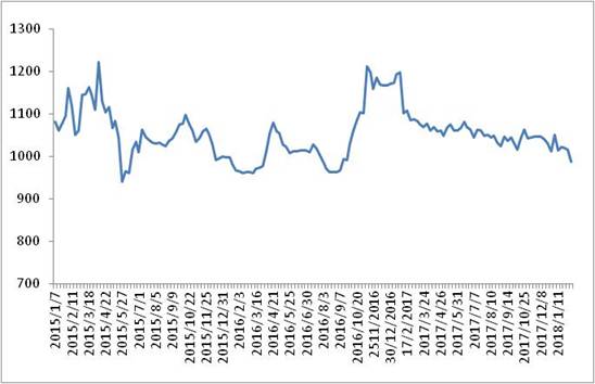 圖 1 2015-2018年各周中國公路物流運(yùn)價(jià)指數(shù)