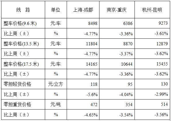 各車型指有不同程度回落,其中整車指數(shù)、零擔(dān)重貨指數(shù)環(huán)比回落幅度低于零擔(dān)輕貨指數(shù)。其中,整車指數(shù)為989.7點(diǎn),比上周回落2.4%;零擔(dān)重貨指數(shù)為988.6點(diǎn),環(huán)比回落2.4%;零擔(dān)輕貨指數(shù)為979.2點(diǎn),環(huán)比回落4.2%。