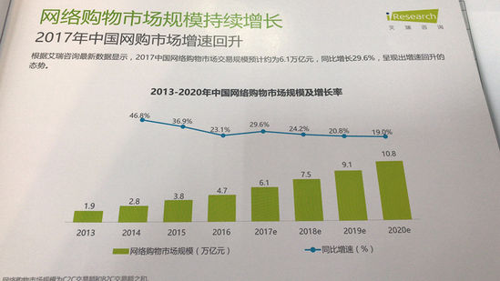 數(shù)據(jù)顯示,2017年中國網絡購物市場交易規(guī)模預計約為6.1億元,同比增長29.6%,較前幾年有小幅度的回升。