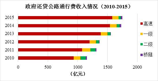 2015年度,政府還貸公路通行費(fèi)收入1748.6億元,占收費(fèi)公路通行費(fèi)收入的42.7%。其中,政府還貸高速公路通行費(fèi)收入1578.3億元,一級(jí)公路109.3億元,二級(jí)公路34.0億元,獨(dú)立橋梁隧道27.0億元,分別占政府還貸公路通行費(fèi)收入的90.3%、6.3%、1.9%和1.5%。