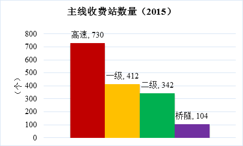 截至2015年底,全國(guó)收費(fèi)公路共設(shè)主線(xiàn)收費(fèi)站1588個(gè)(省界聯(lián)合設(shè)置的收費(fèi)站,每省按照0.5個(gè)計(jì)算,下同)。其中,高速公路730個(gè),一級(jí)公路412個(gè),二級(jí)公路342個(gè),獨(dú)立橋梁隧道104個(gè),分別占主線(xiàn)收費(fèi)站數(shù)量的46.0%、25.9%、21.5%和6.5%。
