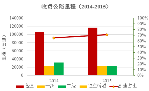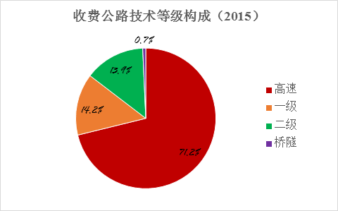 截至2015年底,全國(guó)收費(fèi)公路里程為16.44萬(wàn)公里,占公路總里程457.73萬(wàn)公里的3.6%。其中,高速公路11.70萬(wàn)公里,一級(jí)公路2.34萬(wàn)公里,二級(jí)公路2.29萬(wàn)公里,獨(dú)立橋梁隧道1168公里,分別占收費(fèi)公路總里程的71.2%、14.2%、13.9%和0.7%。