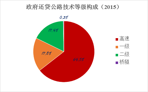 截至2015年底,全國(guó)政府還貸公路里程10.21萬(wàn)公里,占全國(guó)收費(fèi)公路里程的62.1%。其中,政府還貸高速公路6.58萬(wàn)公里,一級(jí)公路1.82萬(wàn)公里,二級(jí)公路1.78萬(wàn)公里,獨(dú)立橋梁隧道289公里,分別占政府還貸公路里程的64.5%、17.8%、17.4%和0.3%。政府還貸高速公路占收費(fèi)高速公路里程的56.3%。