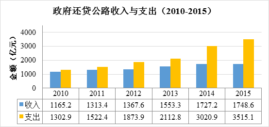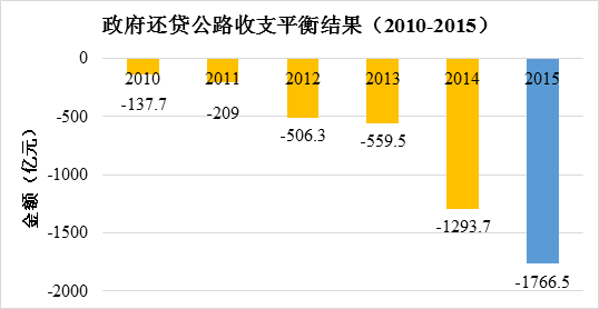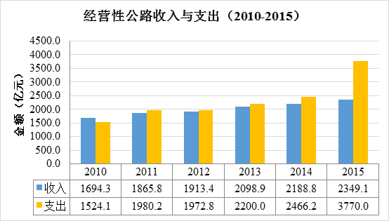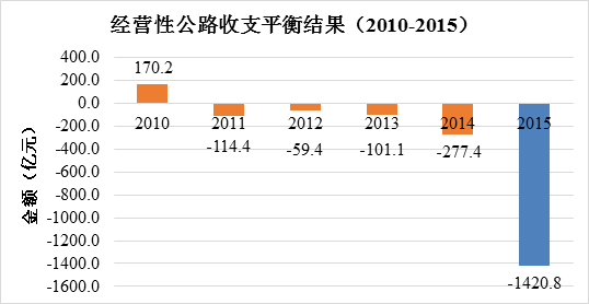 2015年全國(guó)收費(fèi)公路收支平衡結(jié)果為-3187.3億元。與2010年至2014年(收支平衡結(jié)果依次為:32.5億元、-323.3億元、-565.7億元、-660.5億元和-1571.1億元)相比,收支缺口進(jìn)一步擴(kuò)大。