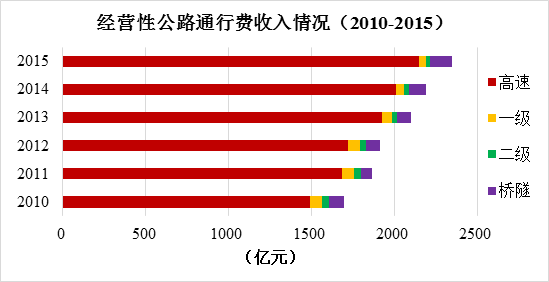 與2014年相比,經(jīng)營(yíng)性公路車(chē)輛通行費(fèi)總收入由2188.8億元增加到2349.1億元,凈增160.3億元,增長(zhǎng)7.3%。其中,高速公路由2009.3億元增加到2146.5億元,凈增137.2億元,增長(zhǎng)6.8%;一級(jí)公路由50.3億元減少到43.4億元,凈減6.9億元,減少13.7%;二級(jí)公路由28.4億元減少到25.5億元,凈減2.9億元,減少10.1%;獨(dú)立橋梁隧道由100.7億元增加到133.7億元,凈增33.0億元,增長(zhǎng)32.8%。